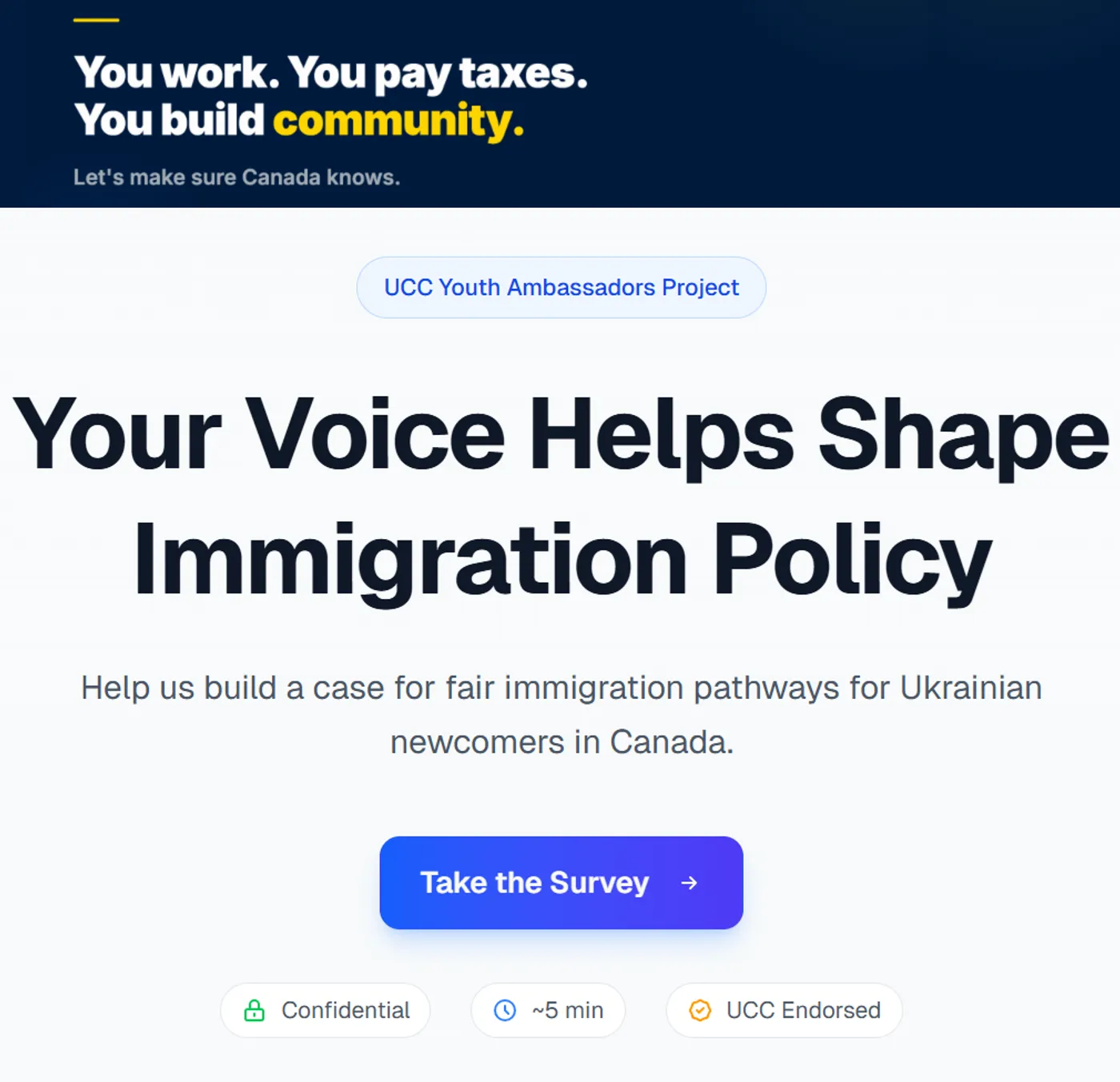 U4C — це проєкт Програми Молодих Амбасадорів UCC, що збирає дані про внесок українських новоприбулих у Канаду — податки, галузі, участь у громаді — щоб підтримати справедливі шляхи до постійного резидентства.